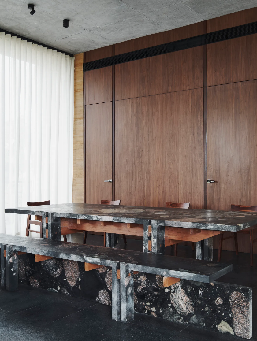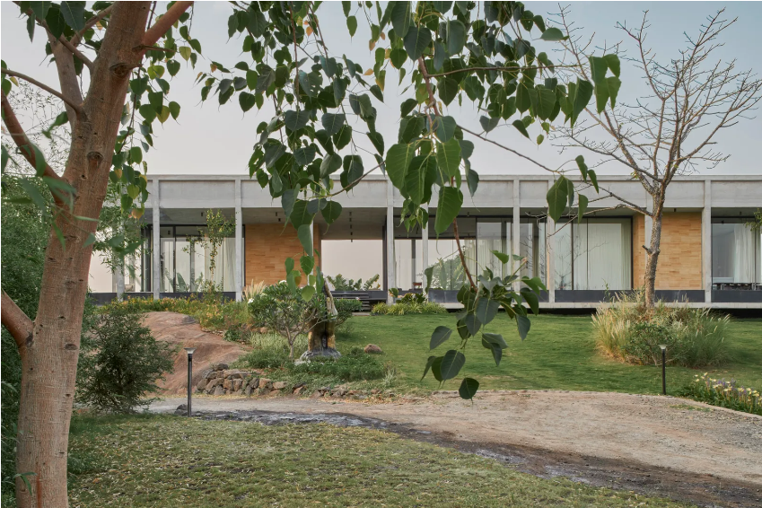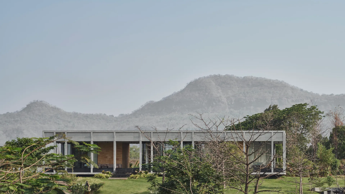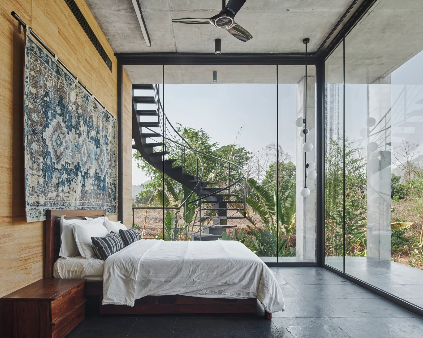 “They were very clear about the fact that they wanted it to be within nature,” explains co-founder Kayzad Shroff, “Almost every single view in every single direction was something that they wanted to take advantage of.” The resulting structure sees a façade that is mostly glass, with the exception of the bathrooms and kitchen. The material palette comprises black stone for flooring and sandstone and concrete for the walls. “They tend to age over time,” says co-founder Maria León, “There is a poetic element to the ageing of architecture, which we wanted to take advantage of.” The house has indeed already aged—the concrete is darker, as is the sandstone, and some sections of the exterior have started gathering moss. “As it ages, it will blend into the backdrop, and that was something that we were hoping for from the beginning,” she adds, “It is not an imposing presence on the site.”