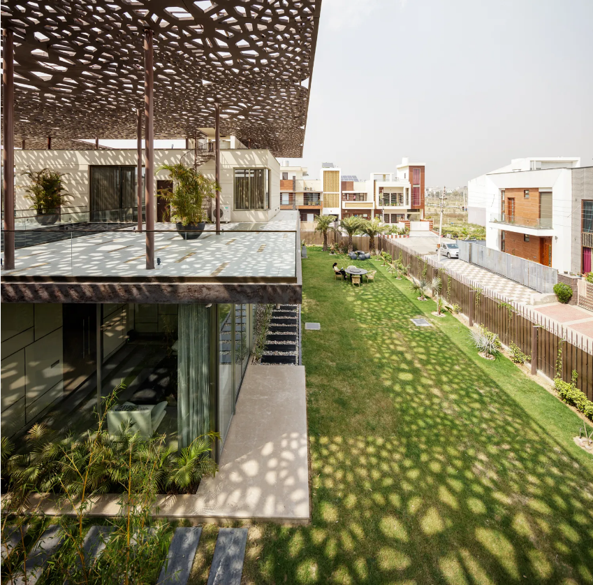 In a small township outside Karnal, Haryana, a palatial home for a joint family has created its own mini ecosystem. Designed by sustainability-focused firm Zero Energy Design (ZED) Lab, House Under Shadows was an experiment in reclaiming the earth in a manner that was eco-friendly, unobtrusive, and even beneficial to the natural flora and fauna of the area. “I still remember, when we first scouted the site, we weren’t able to stand there for even five minutes, we were so desperate for shade,” says Sachin Rastogi, one of the lead architects on the project. “The first thing that came to my mind was [that] we needed to create shade to create liveable conditions—and that’s where we got the idea of creating this canopy.”