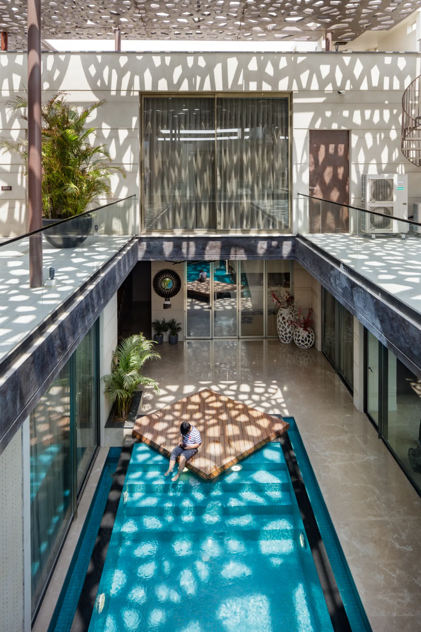 The structure of House Under Shadows was inspired by a neighbouring hotel called Noor Mahal, which was developed along the lines of a haveli. “Traditional havelis were developed with a standard layout: You have a public street outside, and then you have a courtyard which is an internal [open] space, surrounded by a deep veranda all around, which encourages socializing.” The courtyards in both houses have been fitted with an infinity pool, which serves the additional function of cooling the air and thereby creating a favourable micro-climate within the property. “It also lights up beautifully, and the diffused reflection of the sunlight creates a beautiful ambience,” explains Rastogi, “The sound of the water following down, the edge of the pool, and the view of the greenery beyond has a very soothing impact on the entire home.”